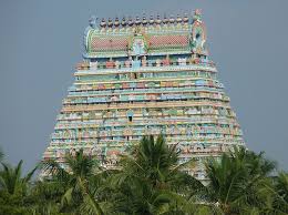 Located in the city of Tiruchirappalli, on a small island between branches of the rivers Kaveri and Coleroon, stands the massive temple of Srirangam. The most revered of the 108 pilgrimage shrines of Vishnu, and the largest temple complex in all of India, it is surrounded by seven concentric walls (the outermost wall having a perimeter of over 3 kilometers) and 21 towers called gopurams. Srirangam enshrines a statue of Vishnu reclining on a great serpent. A legend tells that this idol, known as Sri Ranganatha, was being transported across India to Sri Lanka by the sage Vibhisana. Resting from his efforts for awhile, he set the statue upon the ground, yet when ready to continue his journey, he found the statue had magically bound itself to the earth. A hundred hands could not budge the idol, so a small temple was built over it. The temple complex, which has since grown around the statue, has been rebuilt and enlarged many times over thousands of years and its original date of founding is unknown to archaeology. Most of the temple complex standing today, including a grand hall of 1000 beautifully sculptured pillars, was constructed between the 14th and 17th centuries.